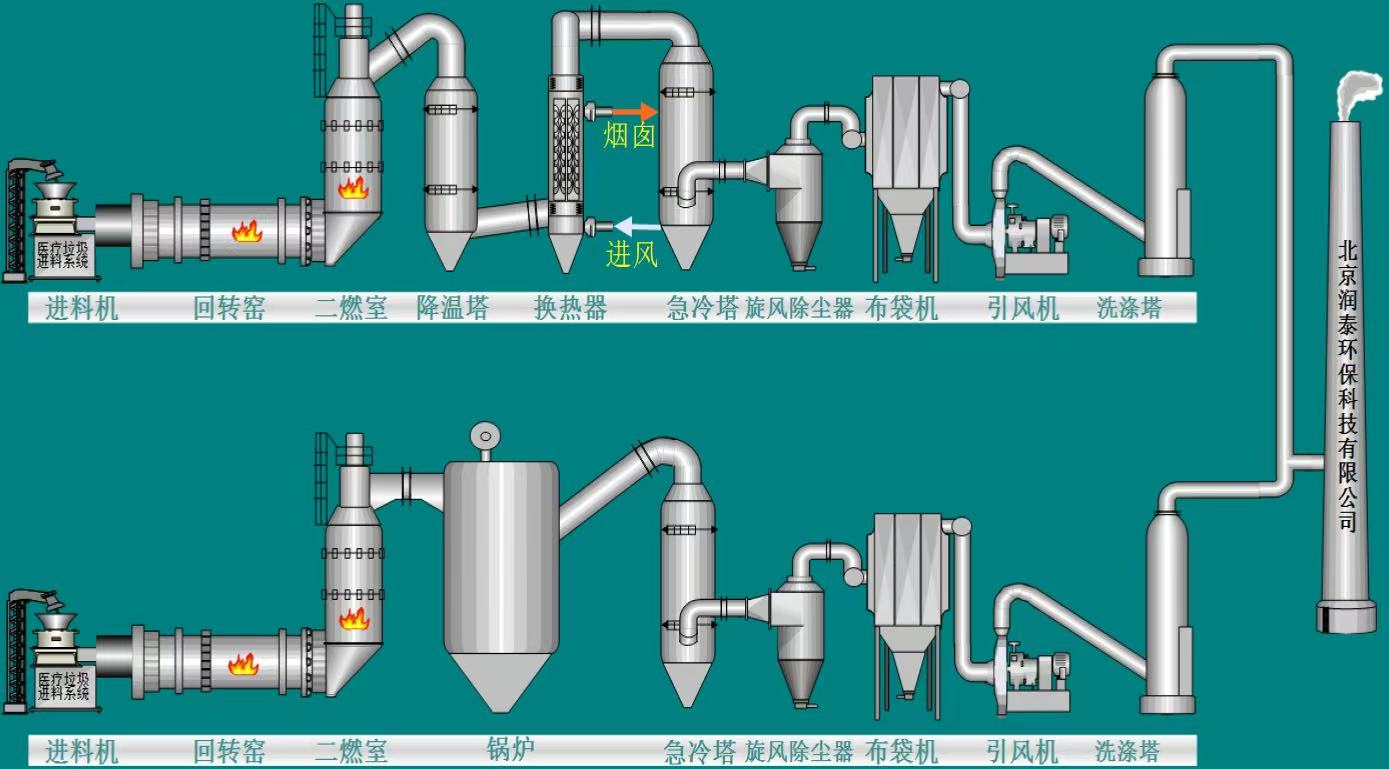 通过1100℃以上的回转窑高温焚烧,结合二燃室的二次燃烧,保证医疗废物的彻底破坏。高温烟气采二流体急冷降温,瞬间降至200℃以下,有效避免二噁英的再生产。烟气除尘采用布袋除尘器并辅助活性炭加药系统,有效捕集飞灰、重金属、二噁英等有害物质。除尘后的烟气经湿式脱酸塔液碱逆向脱酸后,通过烟囱排放。产生的废水,经自建的污水处理厂处理达标后排放。